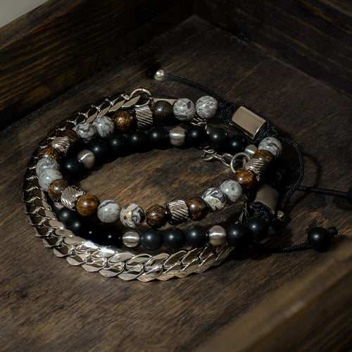 SON Armband schwarz agate/lava/Tigerauge m.Stahl
